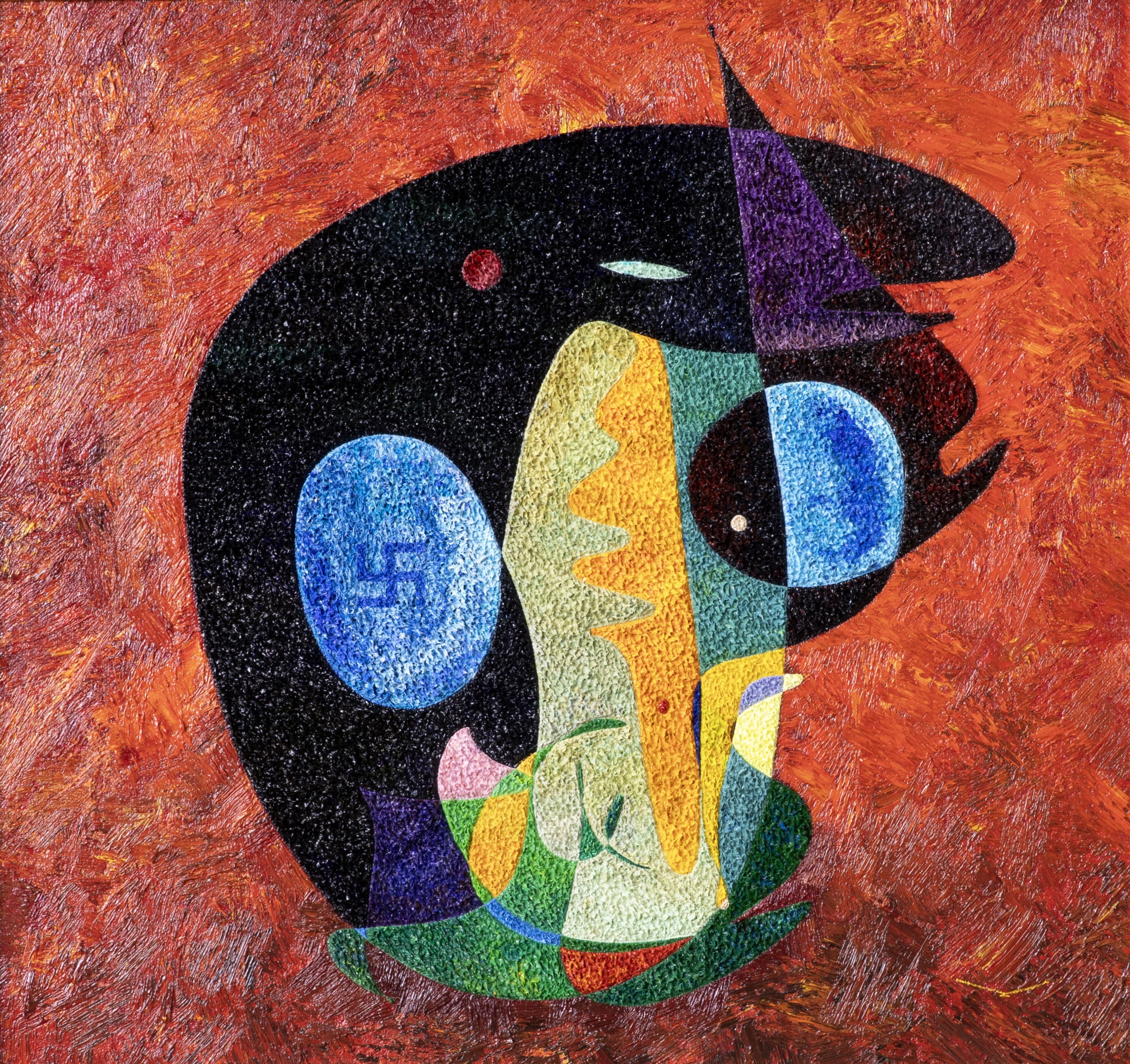 “Il Re della Democrazia” presenta una composizione complessa e stratificata in cui una figura centrale astratta emerge da uno sfondo rosso saturo. Realizzata a olio e acrilico su tela di lino, l’opera combina texture espressive, contrasti cromatici e sottili elementi figurativi per costruire un campo visivo e concettuale denso.